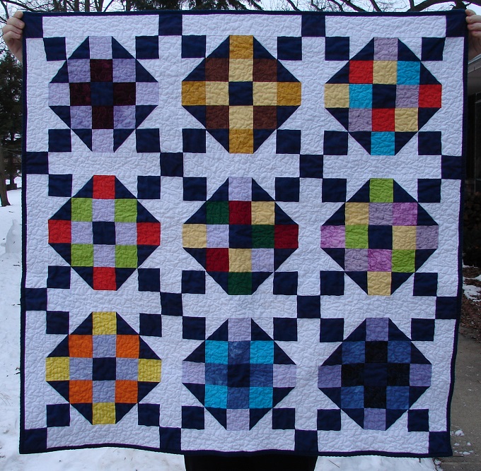 This quilt was started in a class I took on January 4 about using the color wheel in quilts. We were to choose a focus fabric and build our blocks using the color wheel based starting with that focus fabric. My focus fabric is the dark blue. All the squares and cornerstones.